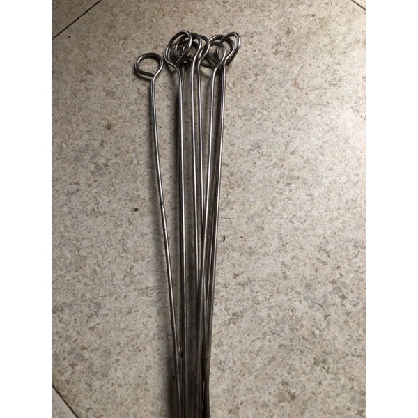 Nhà em bán loại xiên nướng thịt bằng inox dày 4mm cực kỳ cứng cáp, dài 60cm nên thoải mái nướng mà ko lo bỏng tay luôn ạ.