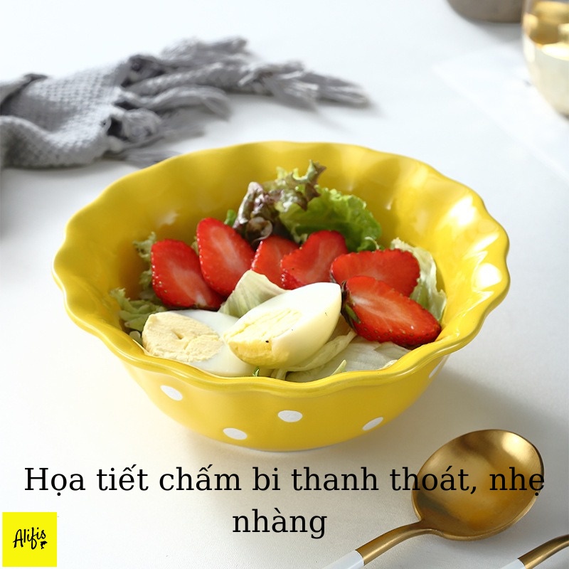 🌻 Tên sản phẩm: Bát ăn cơm bằng sứ, tô canh miệng viền loe họa tiết chấm bi trắng- dùng trong nhà bếp
