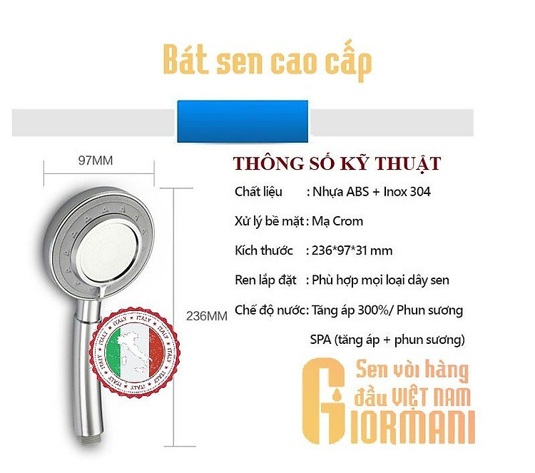 Giới thiệu Bát sen tăng áp 3 chế độ + Dây sen 3 lớp 1.5m + Giá đỡ dán tường cao cấp đạt chuẩn chất lượng GIORMANI