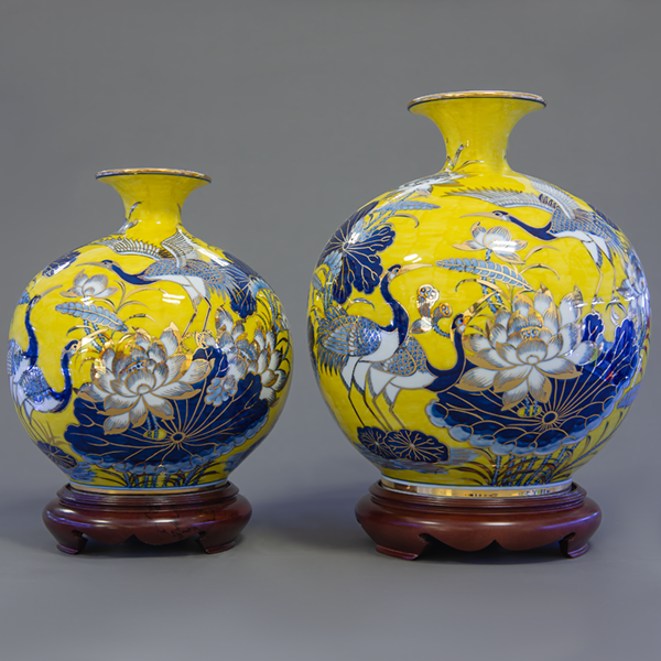 - Họa tiết Sen hạc trên bình hút tài lộc Phùng Gia được vẽ tay thủ công tinh xảo, được sử dụng chất liệu vàng thật, sang trọng, mang lại tài lộc, phú quý cho gia chủ.