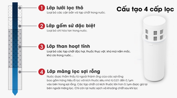 Cấp 4 - Lớp màng lọc sợi rỗng nước thẩm thấu qua thành ống của các sợi rỗng có hàng triệu lỗ lọc siêu nhỏ chỉ từ 0.01 – 0.1µm, đi vào bên trong giữ lại các tạp chất có kích cỡ lớn hơn 0.1µm như rỉ sét, vi khuẩn, vi sinh vật, tảo, nấm mốc, kim loại nặng, thoát ra ngoài cuối cùng là nguồn nước sạch.