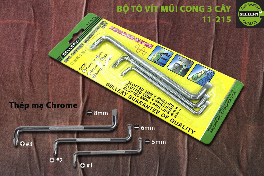 - Thấu hiểu điều đó, Sellery đã mang tới sản phẩm bộ tô vít mũi cong 3 cây Sellery 11-215. Đây là dụng cụ cầm tay hữu ích với hình chữ Z, bao gồm 1 đầu vặn dẹt và một đầu vặn 4 cạnh. Bộ tô vít giúp bạn thao tác được cả trong không gian chật hẹp, hoặc ngóc ngách khó vặn nhờ góc vuông.