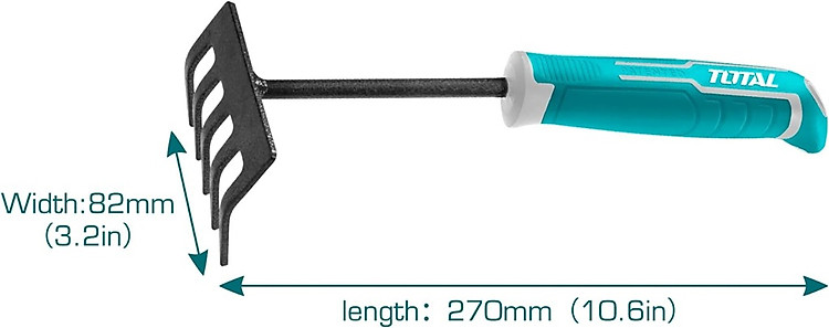 - Cây cào đất làm vườn 270mm TOTAL THFTR1008 có chiều dài 270mm, là kích thước lý tưởng để bạn tiếp cận các khu vực hẹp và khó tiếp cận trong vườn. Kích thước này cũng giúp tạo ra lực cào đất tốt và tiết kiệm sức lực.