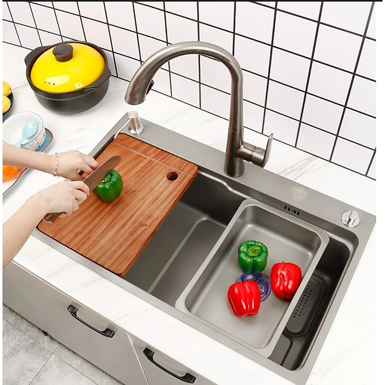 Chậu gồm: Chậu nano đen bạc + bộ xả chống hôi + khay inox và thớt (không bao gồm vòi và các phụ kiện khác có thể mua riêng)