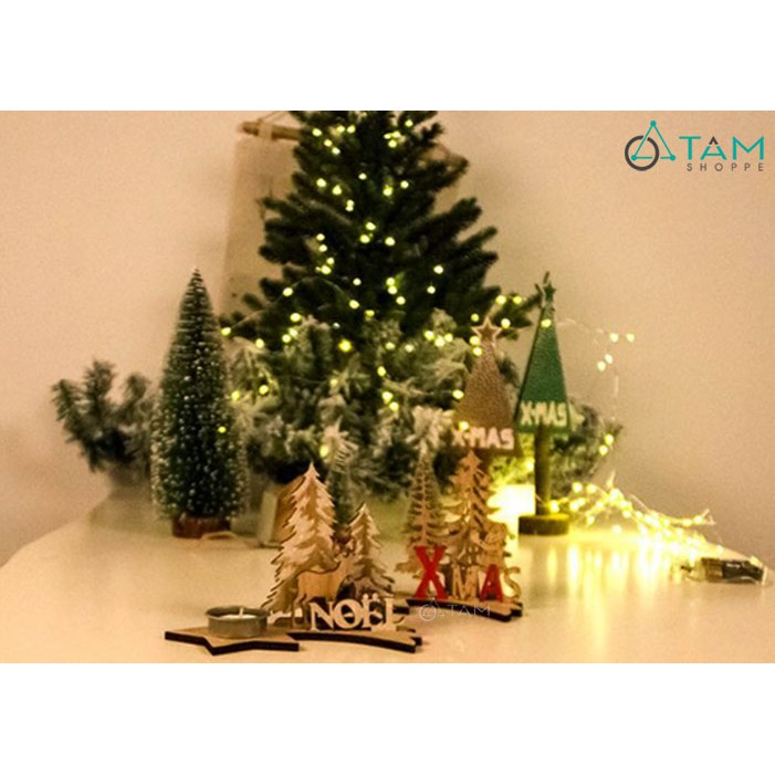 Chân nến Giáng sinh bằng đế thiếc gắn trên tiểu cảnh bằng gỗ mộc mạc, xinh xắn. Viên nến tealight hoặc nến trụ nhỏ là thích hợp cho đế nến này. Những giọt sáng vàng ấm leo lắt, lấp lánh làm tăng sự ấm áp cho không gian Giáng sinh nhà bạn thêm an lành...