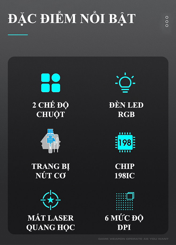 Nhựa nhám chống mồ hôi, trơn trượt, bám vân tayMang 2 chế độ: chơi game ghìm tâm và làm việc văn phòngĐèn LED mang phong cách game thủĐộ nhạy lên đến 6200DPI phù hợp chơi game, làm việc văn phòng, ...