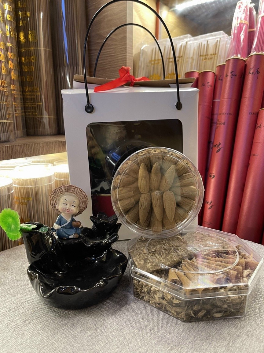 Bộ sản phẩm bao gồm: 1 hộp trầm nụ tháp + 1 hộp combo 3 món ( Dăm trầm tỉa, trầm nụ và trầm miếng ) + Lư xông trầm