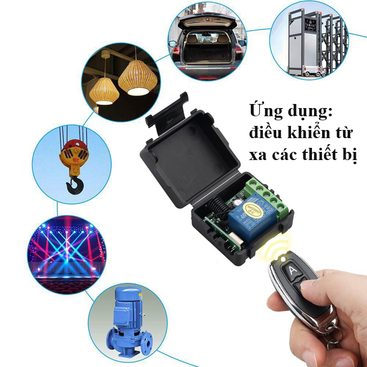 Công tắc điều khiển từ xa 12V: dùng để bật/ tắt các thiết bị dùng điện 1 chiều 12V như đèn, quạt, tắt mở xe máy, cửa ô tô…