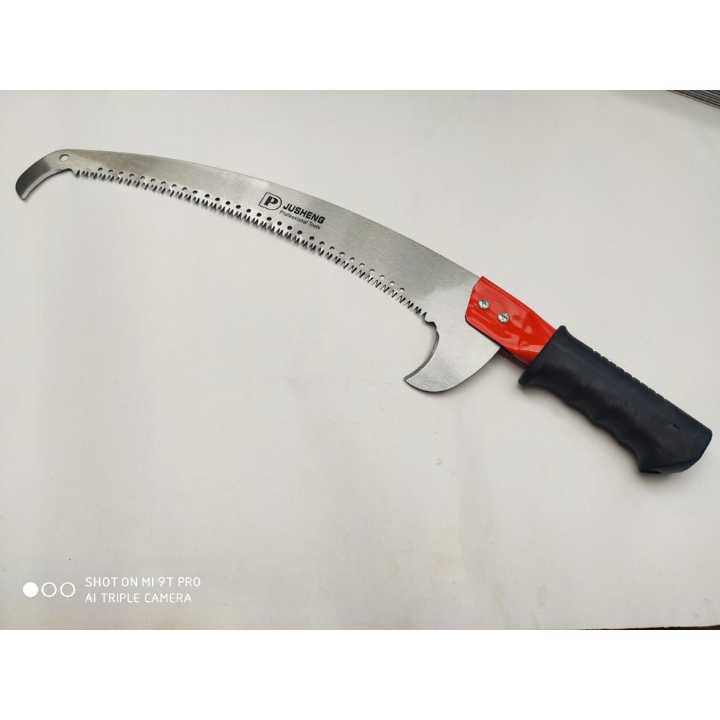 Cưa móc giật cành 2 đầu là một trong những dụng cụ cần thiết cho các nhân viên chăm sóc cây cảnh, nhà vườn và gia đình..Răng cưa lớn , lưỡi cưa có độ cong giúp việc cưa cành trên cao dễ dàng. Đầu cưa có móc sắc giật những cành nhỏ trên cao, Đầu dưới dùng để trẩy cành từ dưới.