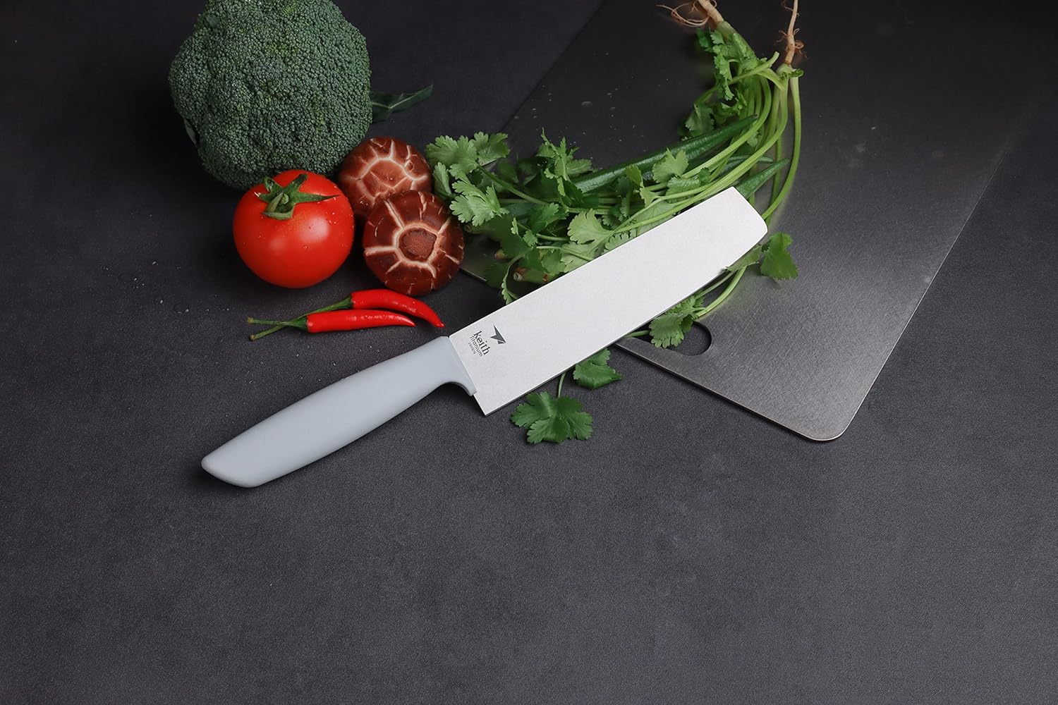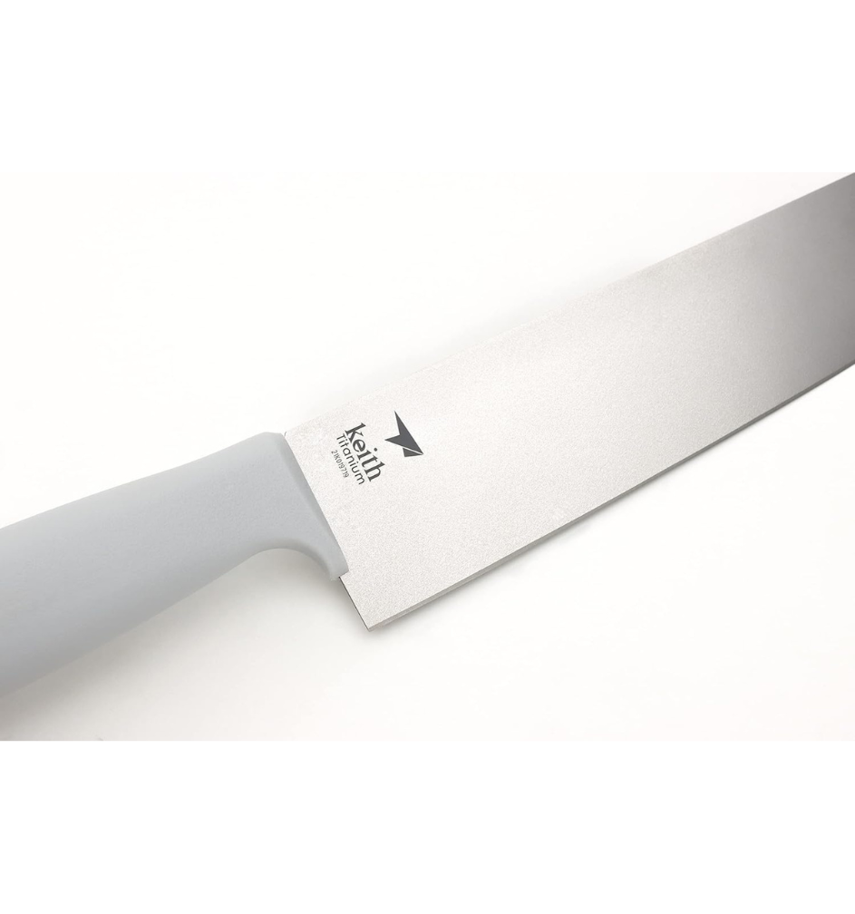 Dao bếp siêu nhẹ Titanium Keith Ti8743 được chế tạo bởi công nghệ kết hợp ba vật liệu bạc-titan-sứ, chỉ đứng sau độ cứng của kim cương, giữ cạnh tốt hơn, không mùi, không vị