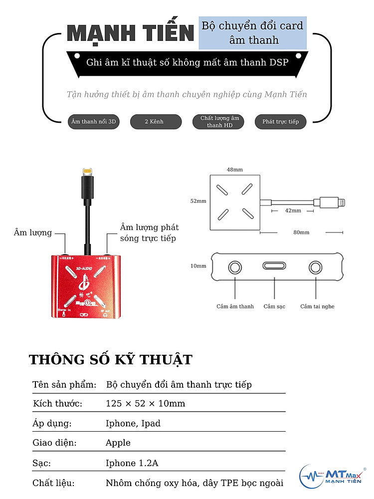 | Kích thước | THÔNG SỐ KỸ THUẬT:Bộ chuyển đổi âm thanh trực tiếpStereo3D AUDIOKích thước: 125 × 52 × 10mmÁp dụng: iphone/ipadGiao diện: AppleSạc: iphone 1.2AChất liệu: Nhôm chống oxy hóa + dây TPE bọc ngoài#daylivestreamStereo3DAUDIO #Stereo3DAUDIO#b |