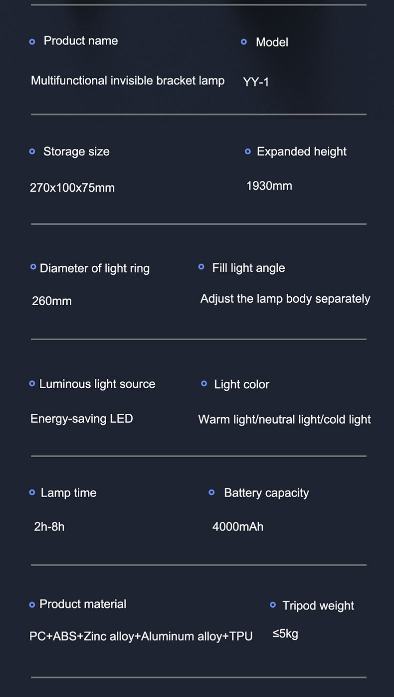 | Hướng dẫn sử dụng | Đèn vòng có thể gập lại.Có 3 chế độ sáng: ánh sáng vàng (3000K), trắng mát (4000K) và trắng tự nhiên (5500K). |
