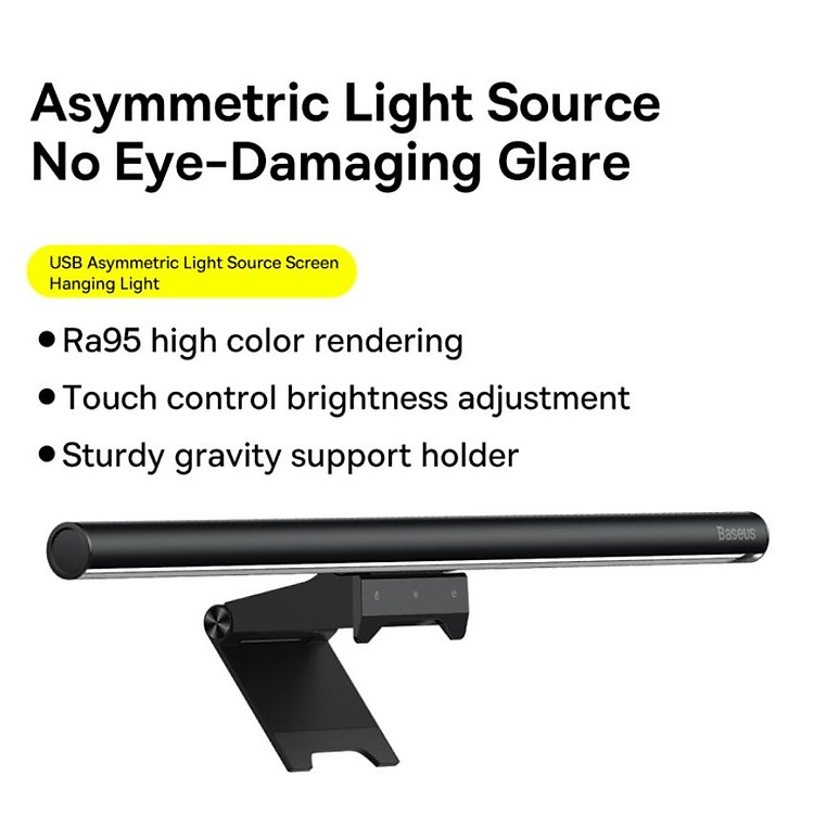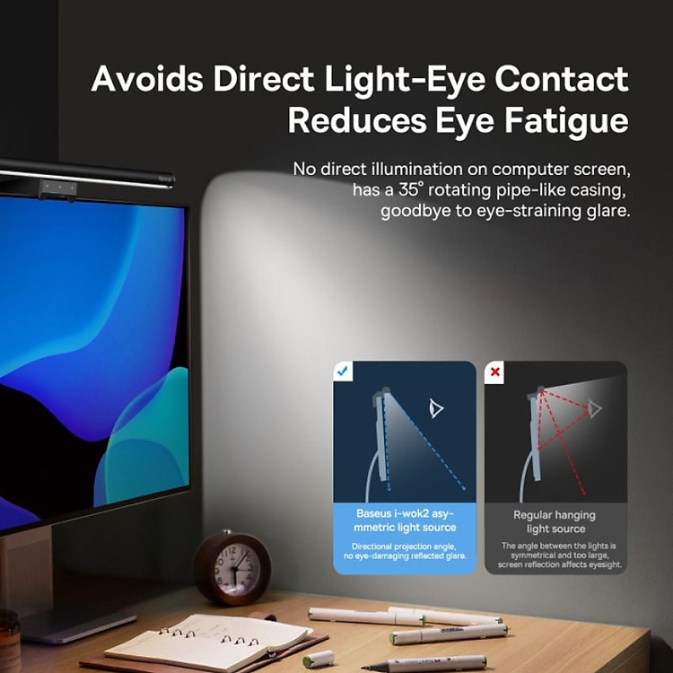 - Đèn treo màn hình Baseus i-wok2 được thiết kế ánh sáng không đối xứng, chiếu sáng không gian làm việc của bạn chứ không phải màn hình máy tính có trải nghiệm tối ưu nhất. Góc chiếu định hướng không bị chói phản xạ hại mắt.