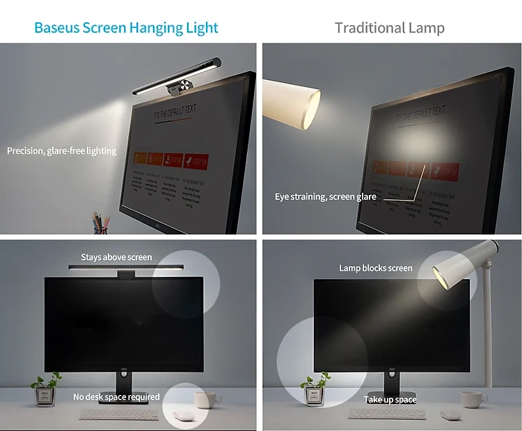 - Đèn treo màn hình bảo vệ mắt Baseus i-Work Pro Series có tác dụng chiếu sáng phạm vi hẹp gồm màn hình và bàn làm việc mang đến không gian làm việc thoải mái cho người sử dụng đồng thời không ảnh hưởng đến mọi người xung quanh.