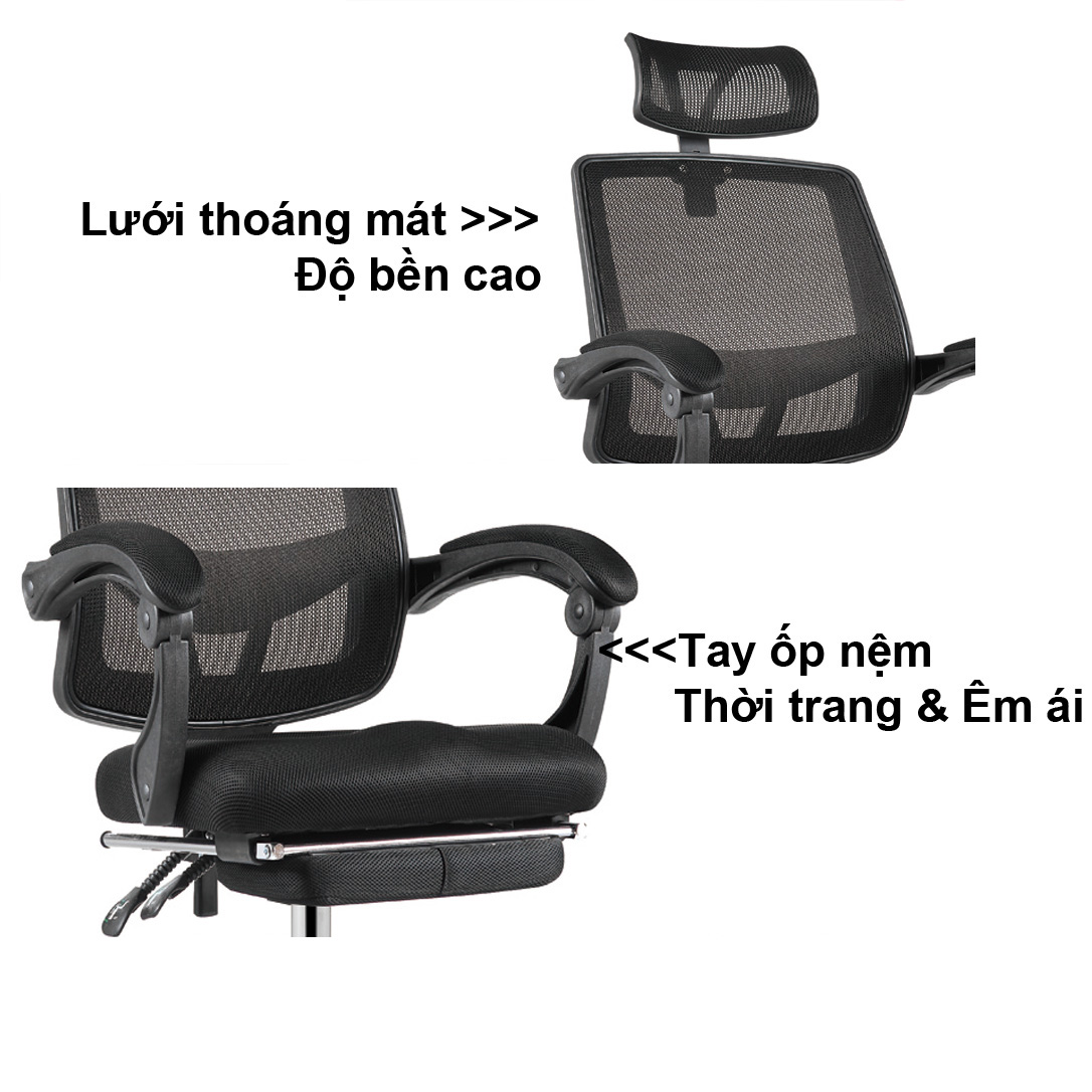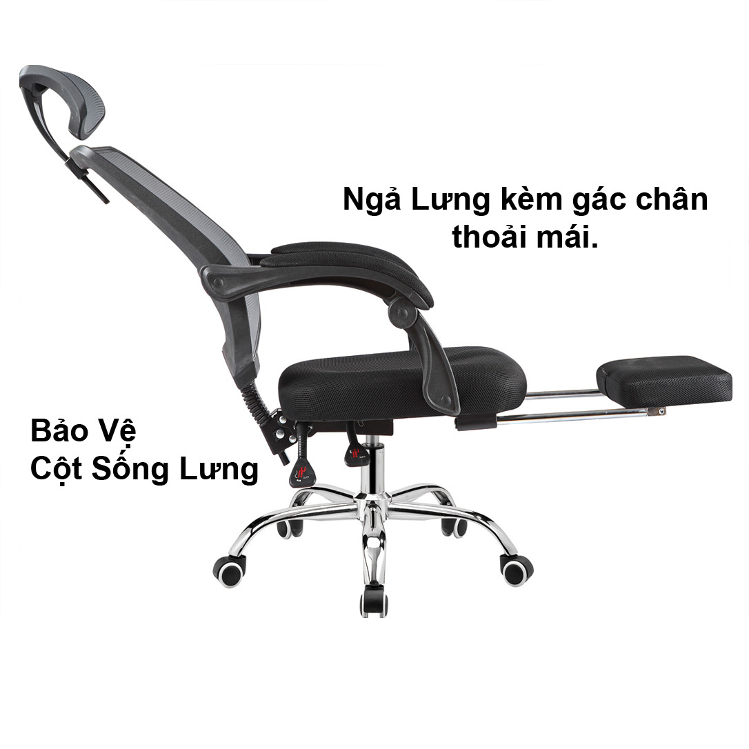 - Tựa đầu bằng lưới êm ái, kèm gác chân bằng nệm cực êm khi ngã lưng