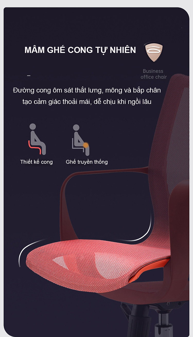 Đường cong vừa vặn với mông, bắp chân thẳng đứng tự nhiên không ép chân, tạo cảm giác thoải mái, dễ chịu khi ngồi lâu.