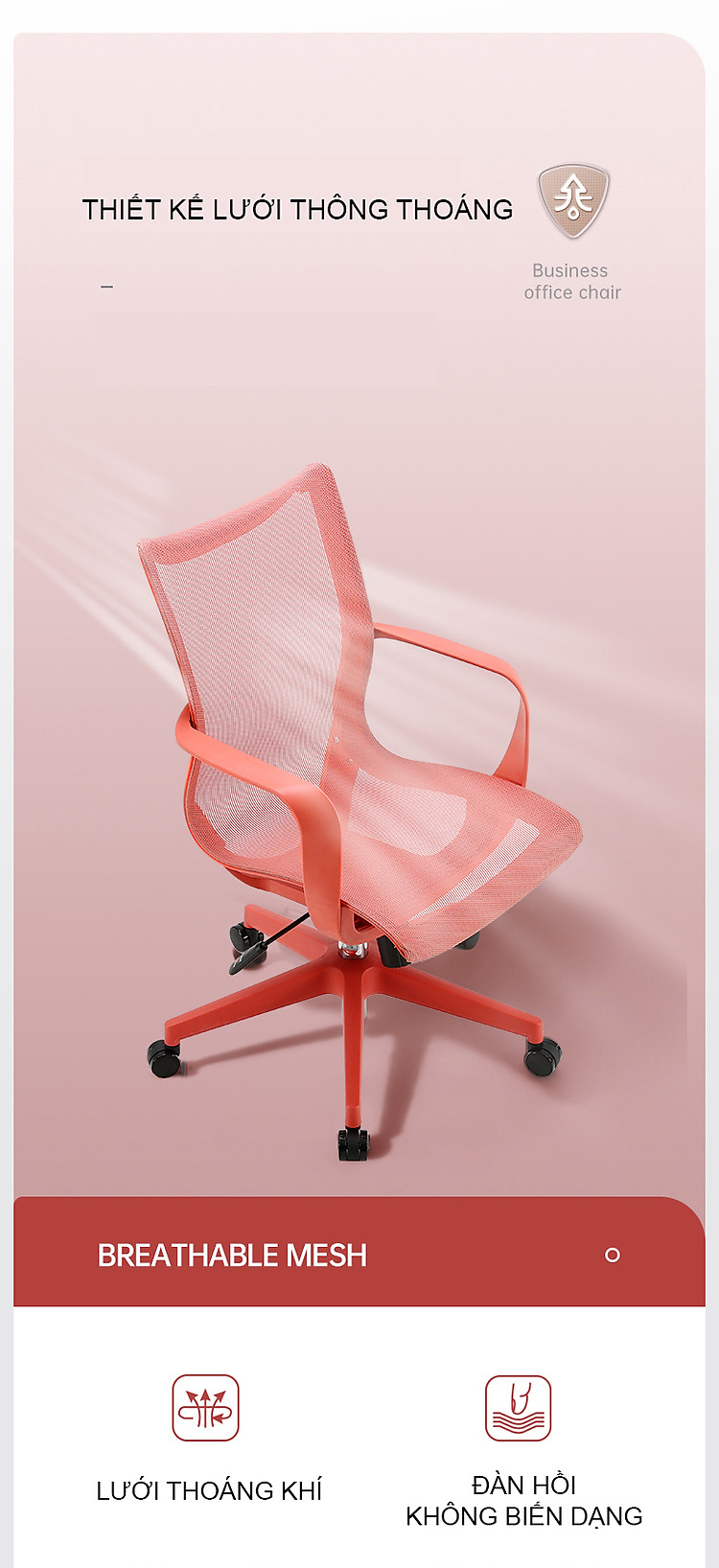 Toàn bộ ghế được làm bằng lưới đặc biệt thoáng khí, tạo cảm giác sảng khoái và thoải mái, độ đàn hồi cao và độ bền kéo mạnh mẽ.