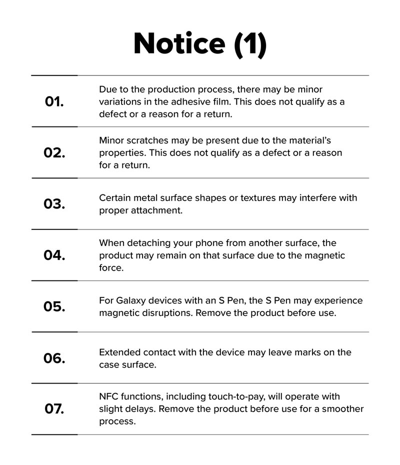 - Sử dụng sản phẩm này trong thời gian dài có thể tạo thành vết hằn nam châm trên bề mặt ốp lưng.