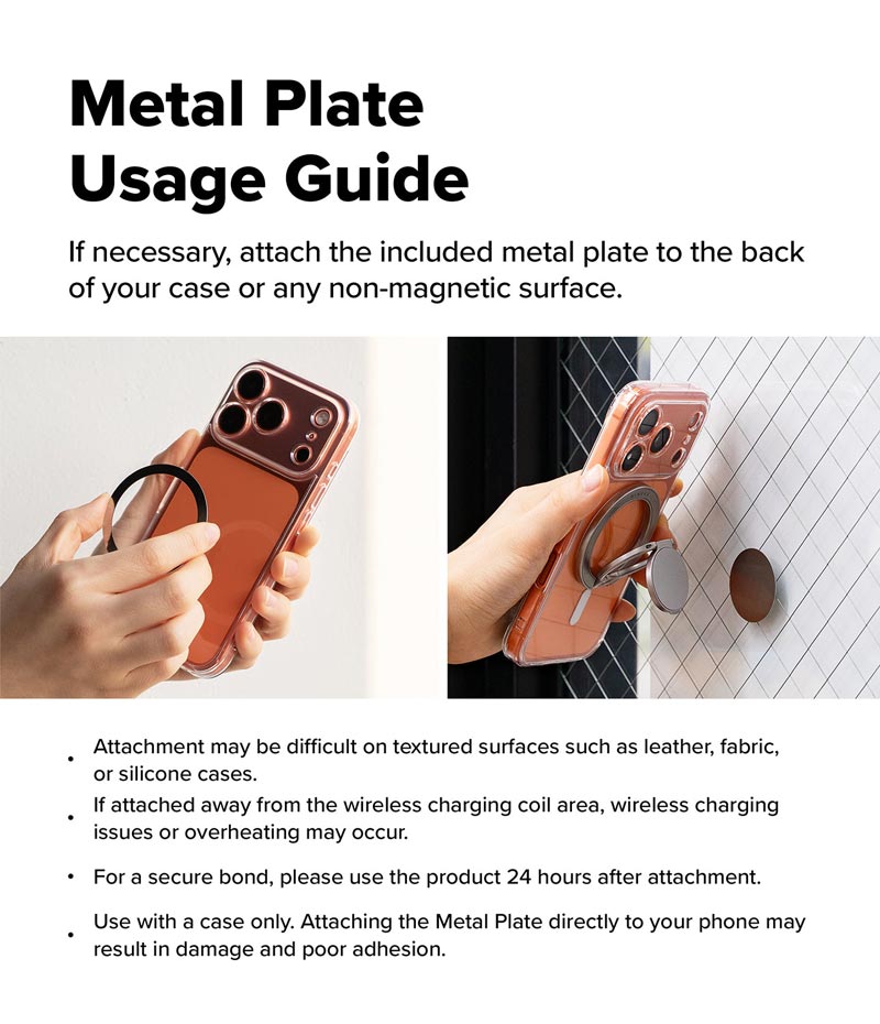 Nếu cần thiết, hãy gắn tấm kim loại đi kèm vào mặt sau của ốp lưng hoặc bất kỳ bề mặt không nhiễm từ nào.