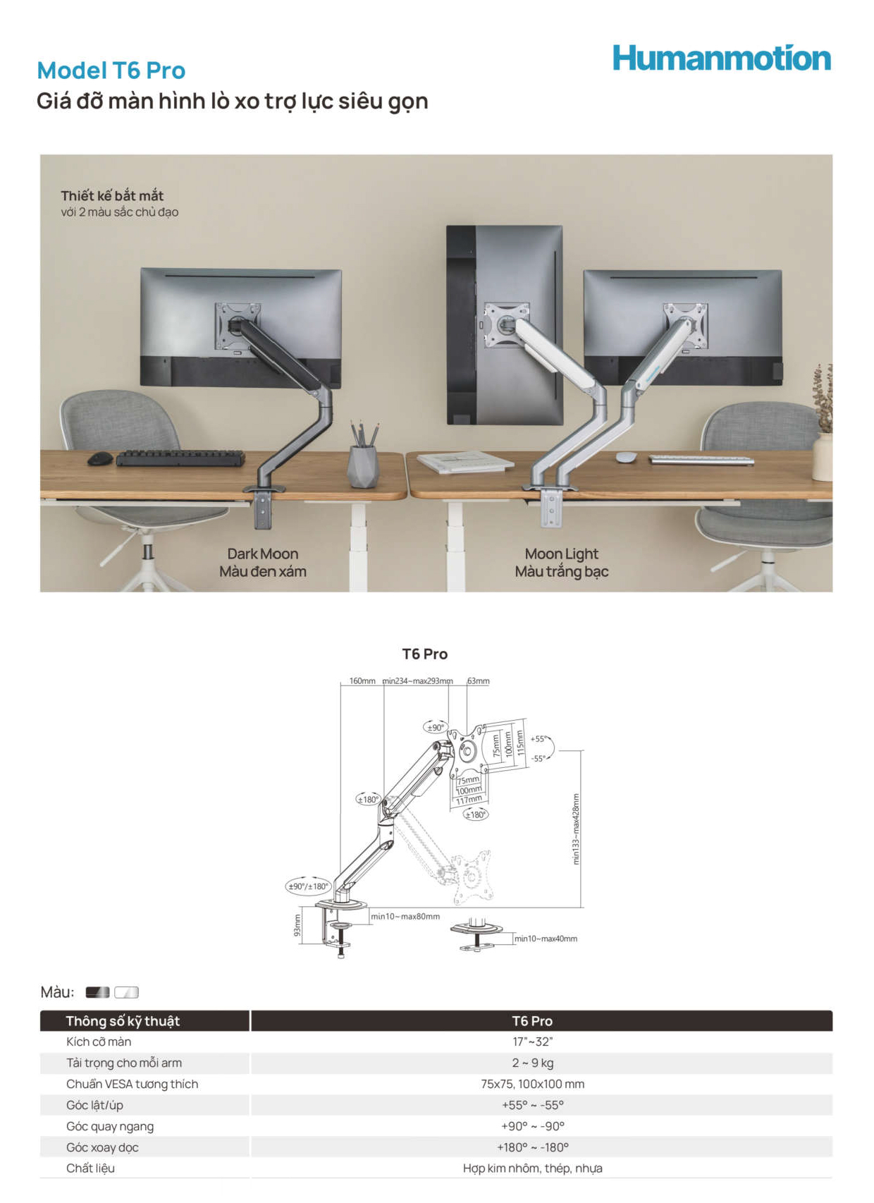 Kích thướcThông số kỹ thuật:ModelT6PRO-W / T6PRO-HĐộ dày bàn10~80mmNặng2,6kgKích thước117x520x655mmNâng hạ độ cao133~428mmVươn rộng tối đa515mmGóc xoay dọc-180°~+180° = 360°Góc quay ngang-90°~+90° = 180°Góc lật màn (úp/ngửa)-55°~+55° = 110°Kích cỡ màn17"~32"Trọng lượng màntừ 2-9kgVESA75x75m / 100x100mmMàu sắcTrắng, ĐenChất liệuHợp kim nhôm, thép, nhựaNâng tối đa9kgKích cỡ màn17 ~ 32"Bảo hành24 tháng