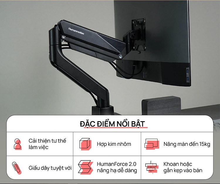 - Human Motion hỗ trợ 2 hình thức là kẹp bàn và khoan lỗ trên mặt bàn. Rất linh hoạt để khách hàng lựa chọn.