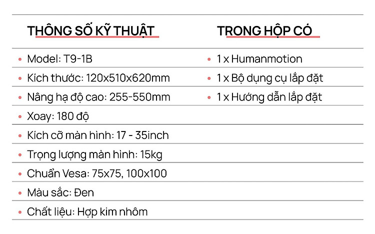 Sản phẩm giá đỡ màn hình máy tính Human Motion T9-1B Pro đang được bày bán với giá cực kỳ ưu đãi: 1.950.000đ. Đây là một mức giá hợp lý vừa túi tiền, nhưng lại sở hữu những ưu điểm nổi bật mà không phải giá đỡ màn hình nào cũng có được.