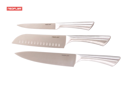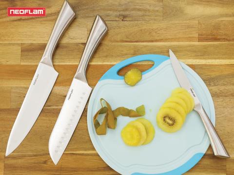 Bộ dao Neoflam gồm 3 dao: Dao chef, dao santoku 7' và dao gọt. Dao được làm từ thép chống gỉ hàm lượng các bon cao, sắc bén và sạch bóng, dễ dàng chế biến thực phẩm và làm sạch.