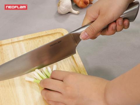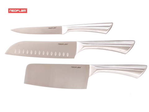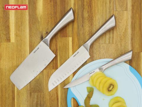 Bộ dao Neoflam gồm 3 dao: Dao chef, dao chặt và dao gọt. Dao được làm từ thép chống gỉ hàm lượng các bon cao, sắc bén và sạch bóng, dễ dàng chế biến thực phẩm và làm sạch.