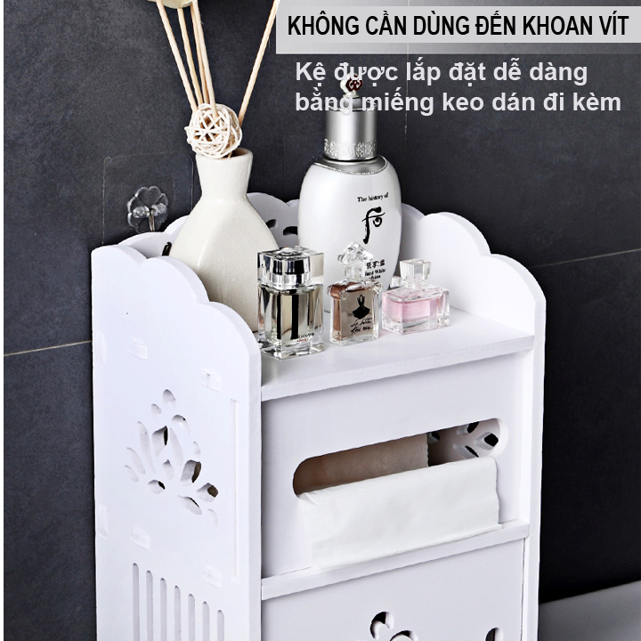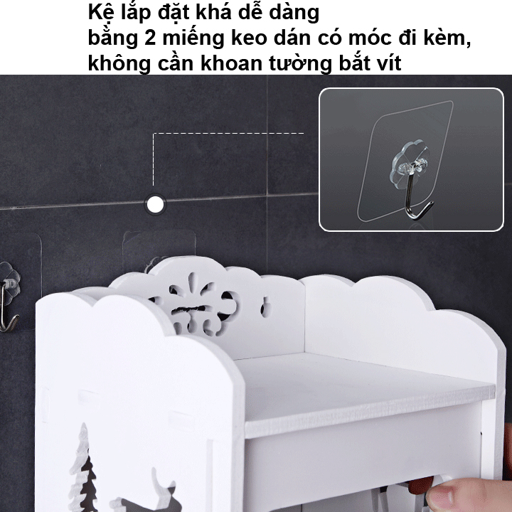 Kệ được lắp đặt dễ dàng bằng miếng keo dán đi kèm, không cần dùng đến khoan vít.
