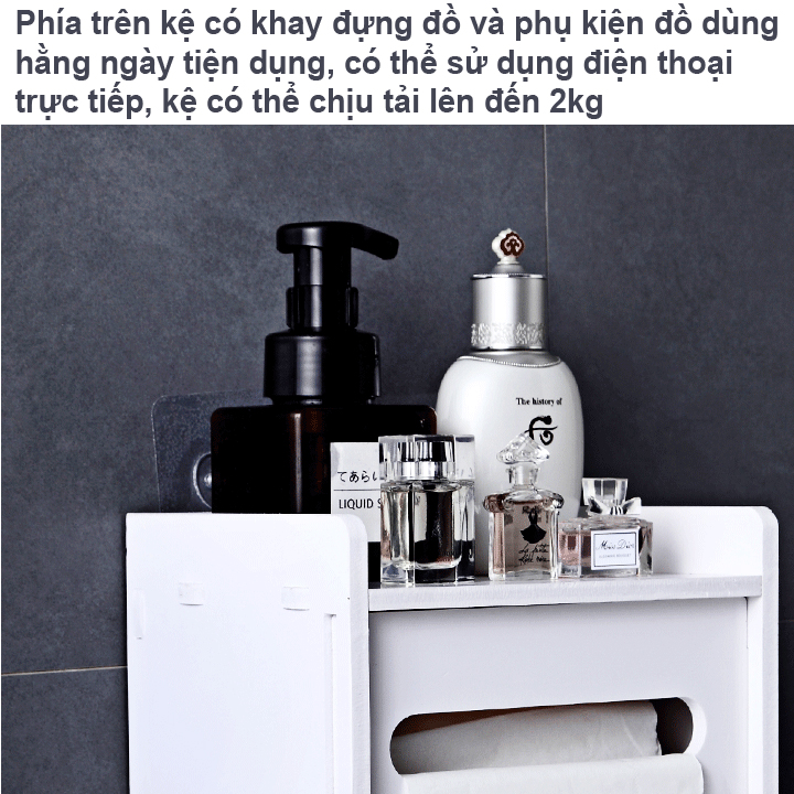 Phía trên kệ có khay đựng đồ và khe cắm điện thoại tiện dụng, có thể sử dụng điện thoại trực tiếp, kệ có thể chịu tải lên đến 2kg