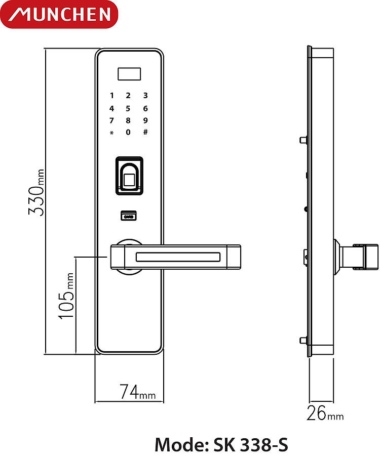 Có thể cài đặt 100 password, 150 vân tay, 150 thẻ từ. Sẵn theo khóa: 2 chìa cơ, 2 thẻ từ.