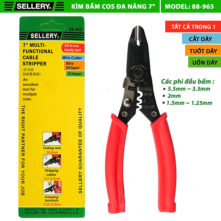 - Kìm bấm cos đa năng 7" 88-965 được làm từ chất liệu thép hợp kim đã qua xử lý nhiệt, là một sản phẩm đến từ hãng Sellery (Mỹ). Kìm bấm cos đa năng 7" 88-965 có nhiều công dụng: Bấm các đầu cos, tuốt dây, cắt dây.
