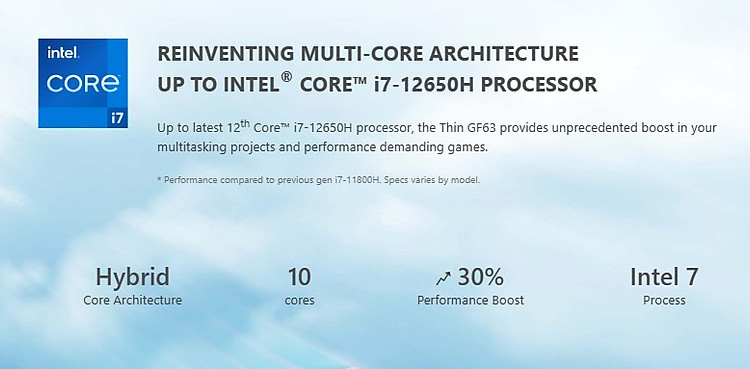 - Bên cạnh thiết kế ấn tượng, MSI Thin GF63 12UC 887VN còn được cải tiến vượt trội về hiệu suất. Bộ xử lý CPU Intel i7-12650H (10 Cores, 16 Threads) Gen 12th đã được tích hợp vào máy, mang lại sự tăng trưởng đáng kể với hiệu suất được cải thiện lên đến 15% so với thế hệ trước. MSI Thin GF63 cũng được trang bị RAM 8GB DDR4 3200MHz và ổ cứng SSD 512GB M.2 PCIe Gen4, dòng gaming GF63 sở hữu sức mạnh vượt trội để đáp ứng nhu cầu làm việc, giải trí và chơi game. Đáng chú ý, cả RAM và ổ cứng SSD của máy đều có thêm slot để người dùng có thể nâng cấp theo nhu cầu, đem lại linh hoạt và khả năng tùy chỉnh cao hơn, giúp cho chiếc laptop trở nên mạnh mẽ và đáp ứng được các yêu cầu sử dụng lâu dài trong tương lai.