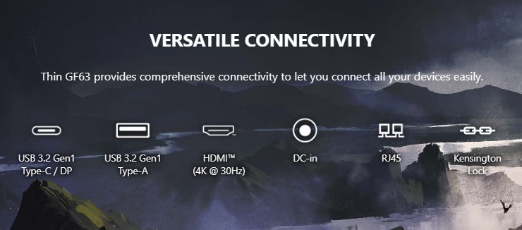 MSI Gaming GF63 Thin tiếp tục tạo sự thuận tiện cho người dùng với những cổng kết nối hiện đại và đa dạng.