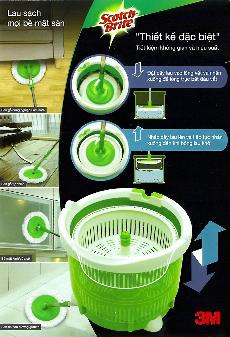 Bộ lau nhà 360 độ nhỏ gọn cao cấp Scotch-Brite 3M BLN-360 là cây lau 2 in 1: giặt và vắt khô trong cùng một chậu. Bông lau được làm bằng những sợi MICROFIBER quấn bụi theo xoáy tròn nên khi khô sẽ không để lại những vết hằn trên sàn nhà