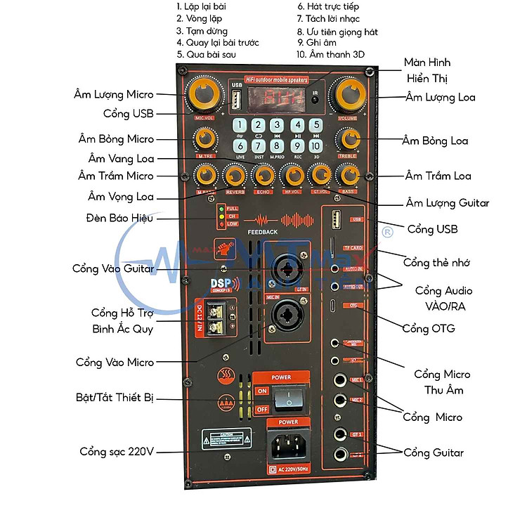 sở hữu màn hình LCD thông minh, thể hiện các thông báo kết nối một cách rõ ràng và dễ dàng. Bạn có thể kết nối thiết bị của mình với loa thông qua các cổng kết nối đa dạng bao gồm Bluetooth, USB, AUX, khe cắm thẻ nhớ TF. Ngoài ra, sản phẩm còn hỗ trợ cổng kết nối cho thiết bị Guitar, OTG, Micro, Condenser MIC, giúp bạn linh hoạt trong việc sử dụng và kết nối.