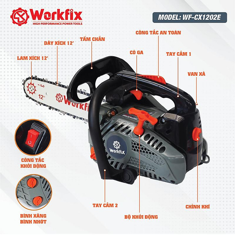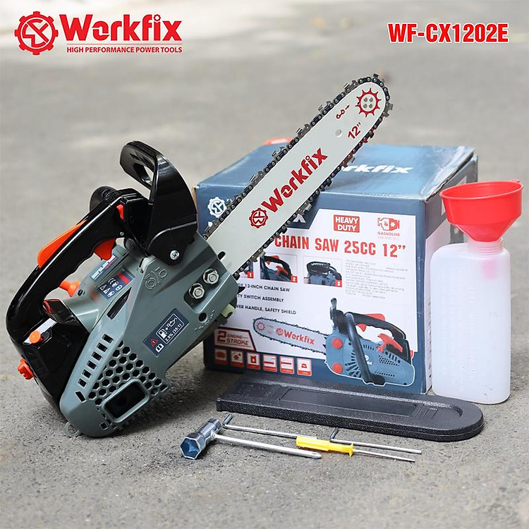 Máy Cưa Xăng 12 Inch Workfix Cầm Tay - WF-CX1202E - Công Suất 900W - Động Cơ 2 Thì 25.4cc - Sử Dụng Xăng Pha Nhớt - Bảo Hành Chính Hãg 6 Tháng