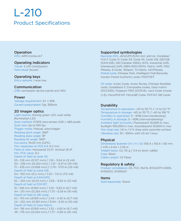 Máy quét mã vạch cầm tay OPTICON L-210 thuộc dòng 210-Series là một sự kết hợp hoàn hảo giữa chuyên môn Nhật Bản hơn 45 năm của Opticon và kỹ thuật tiên tiến của Châu Âu. Sự hợp tác này đã mang lại một thiết kế được chế tạo tỉ mỉ, thông số kỹ thuật và hiệu suất tuyệt vời. Hơn nữa, quy trình sản xuất và các thành phần của chúng tôi đã được lựa chọn cẩn thận để đáp ứng những thách thức hiện tại và vượt quá mong đợi về chất lượng.