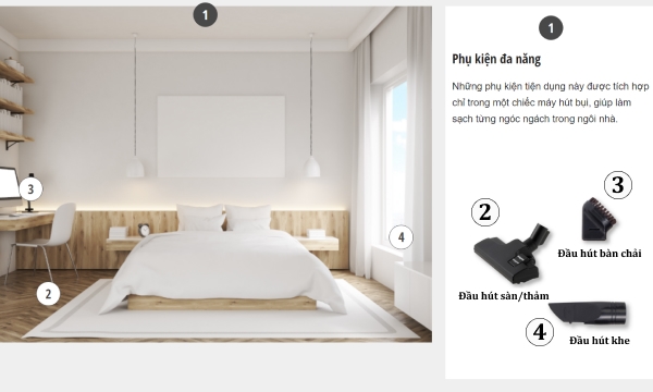 Phụ kiện đi kèm | Bộ lọc thôBộ lọc xả HEPA 6 lớpĐầu hút kheĐầu hút bàn chảiĐầu hút sàn |