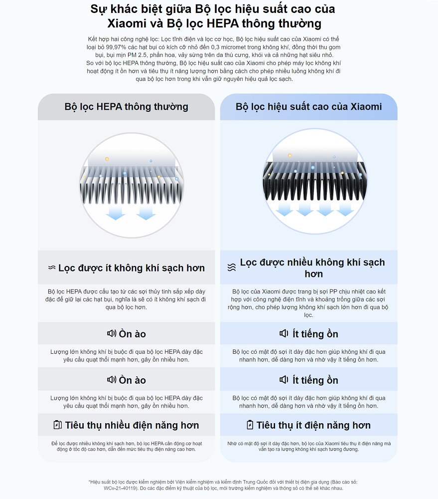 Thiết kế bộ lọc HEPA thế hệ mới với 5 lớp lọc giúp làm sạch bụi bẩn, khử mùi hiệu quả cao. Lớp lọc đầu tiên lọc các hạt lớn cũng như khói bụi, bụi giấy, bụi gỗ, sợi vải, tóc và lông thú cưng. Lớp thứ hai và thứ ba giúp lọc loại bỏ 99.99% các loại virut và kháng khuẩn như H1N1, Ecoli hay Tụ cầu vàng. Tiếp đến lớp thứ tư là bộ lọc HEPA lọc hạt có đường kính 0,3μm trở lên, bao gồm hạt PM2.5, khói, vẩy da thú cưng, phấn hoa, bông và thậm chí cả vi khuẩn gây bệnh. Lớp cuối cùng được làm bằng than hoạt tính chất lượng cao giúp hấp thụ formaldehyd và các hóa chất độc hại khác, cũng như có thể khử mùi hôi.