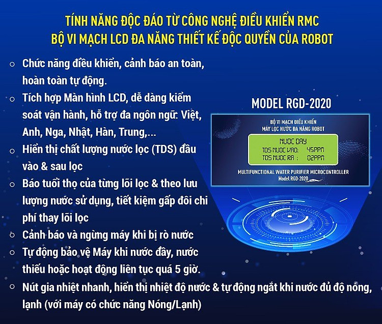 Hệ thống lọc nước R.O 9 cấp lọc, tích hợp Bộ vi mạch & LCD đa năng ROBOT