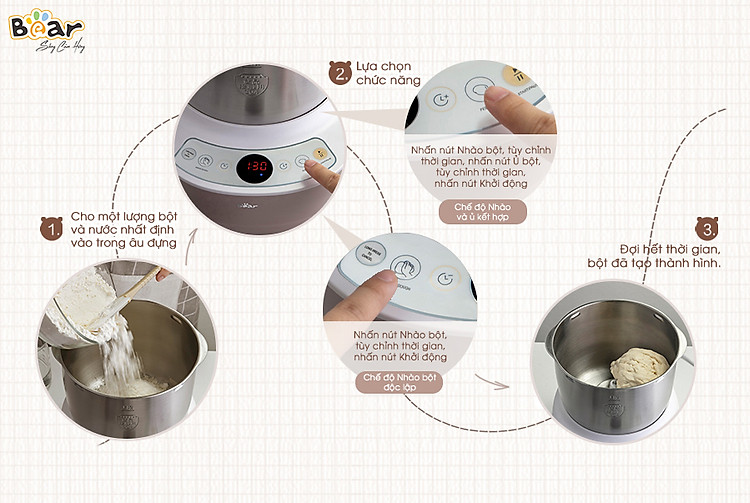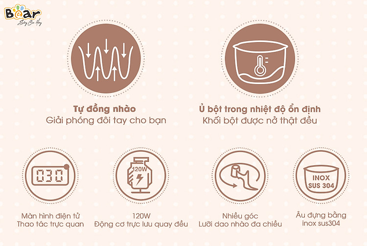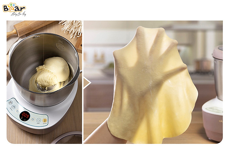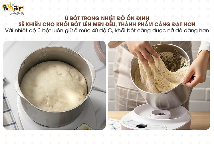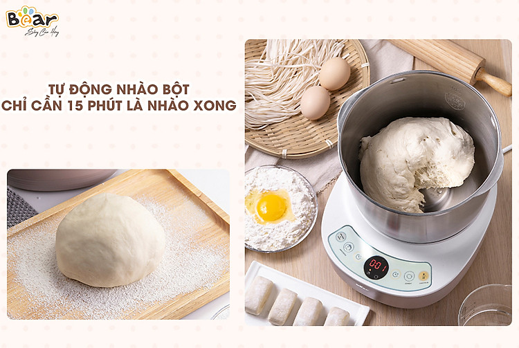 - Với chế độ trộn và ủ bột ổn định, bạn hoàn toàn có thể yên tâm về chất lượng bột bánh. Ngoài ra, bạn có thể tham gia vào Group:  để lấy kinh nghiệm và tham khảo một số công thức làm bánh từ máy trộn bột Bear.