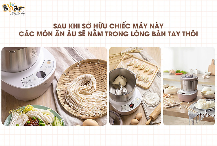 - Ngoài việc làm bánh, máy trộn bột 3.5L Bear còn có thể sản xuất mỳ tươi, vỏ sủi cảo, vỏ há cảo, vỏ bánh gối,