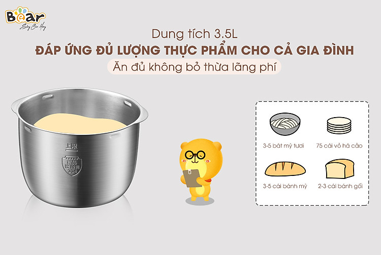 - Với dung tích 3.5L, máy trộn bột Bear - Máy đánh bột có thể trộn và ủ được từ 300 - 700 gram bột. Do đó, dòng máy này phù hợp để làm bánh cho gia đình, KHÔNG PHÙ HỢP để kinh doanh bánh.