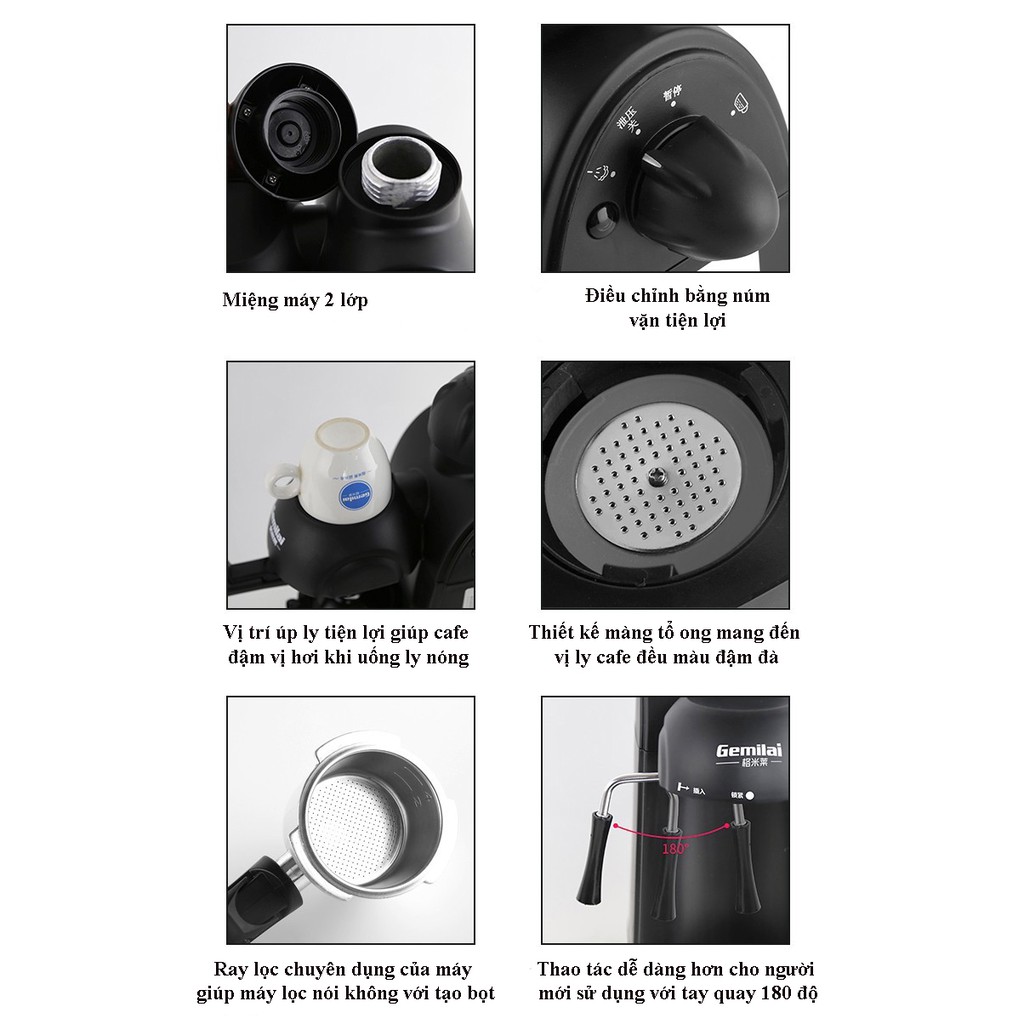 - Bên cạnh chức năng pha espresso, cà phê thường, máy Gemilai CRM2008 được tích hợp vòi phun để tạo bọt sữa cho cappuccino chuẩn. Ngoài ra, thiết bị còn có thể cung cấp khả năng pha 1 - 4 tách cà phê/lần vô cùng tiện lợi.