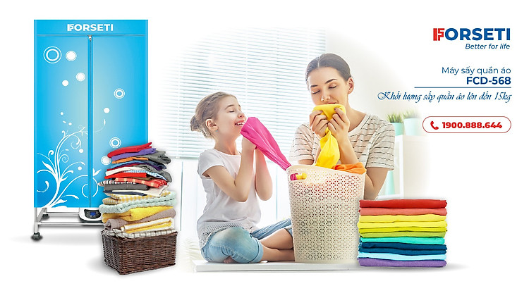 Lưu ý khi sử dụng máy sấy quần áo Nên lắp máy sấy ở nơi khô thoáng Máy phải được đặt ở nơi bằng phẳng, không có vật cản, cách tường 10-15cm. Không để hướng gió bị chặn bởi vật cản Không đưa quần áo ướt (có giọt nước) vào trong máy sấy. Làm khô quần áo hết mức có thể để tránh bị giật điện, hư hại máy Rút điện khi máy không hoạt động Thông số kỹ thuật Máy sấy quần áo Forseti FCD-568 Công suất: 1500W Điện áp: 220-240V 50-60Hz 15kg Kích thước : 710*480*520 Tiêu chuẩn chống nước: IPX1 Khối lượng quần áo sấy: 15kg Chế độ hẹn giờ: 4 tiếng