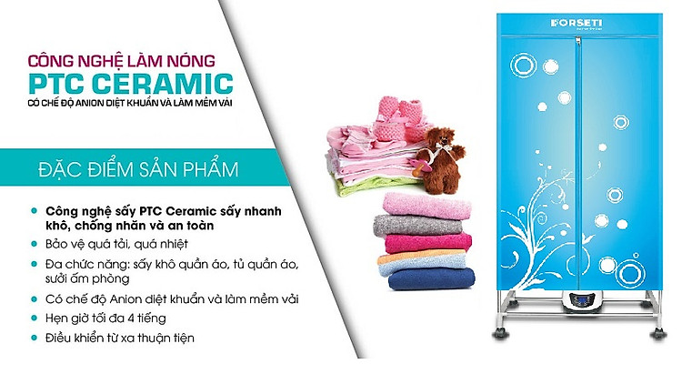 Máy sấy khô nhanh chóng – Tiết kiệm thời gian - An toàn sức khỏe Quần áo được giảm nhăn nhờ phương pháp sấy khô tĩnh học Máy sấy quần áo Forseti FCD-568 sử dụng phương pháp làm khô tĩnh học tức là làm khô nhờ nhiệt đối lưu giúp sấy khô nhanh quần áo tránh làm mài mòn hay làm nhăn quần áo một cách hiệu quả. Cùng với đó, công nghệ sấy cộng hưởng nhiệt PTC trên máy sấy giúp tăng khả năng bảo vệ quần áo lên gấp 2 lần, tránh làm hư tổn quần áo. Máy Forseti FCD-568 tích hợp chế độ hẹn giờ rất tiện lợi. Bạn chỉ cần treo quần áo vào tủ sấy, chọn nhiệt độ, hẹn giờ và quần áo sẽ được sấy khô đúng như mong đợi.