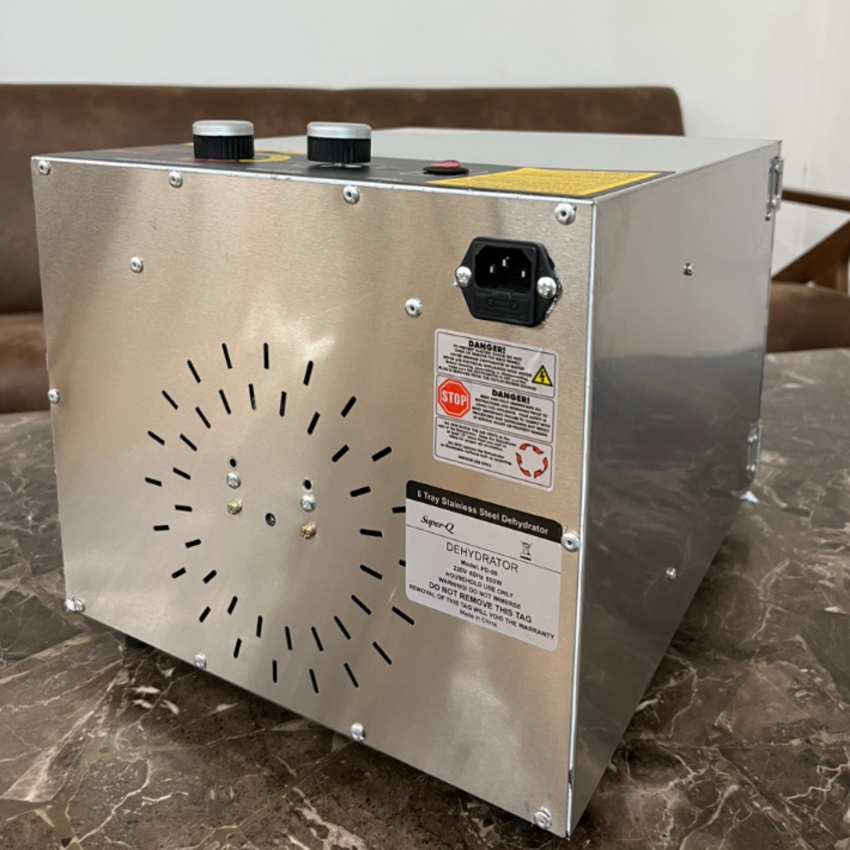 - Bộ gia nhiệt và điện trở nằm ở phía sau cùng, tiếp đến sẽ là quạt gió. Quạt gió vừa có tác dụng hút không khí vào trong, vừa có tác dụng tản nhiệt và thổi hơi nước thừa ra bên ngoài. Đây là chu trình tuần hoàn có sự chuyển tiếp và hỗ trợ qua lại, giúp thực phẩm khô nhanh hơn, khắc phục được tình trạng hút ẩm ngược ở các phương pháp sấy thủ công.