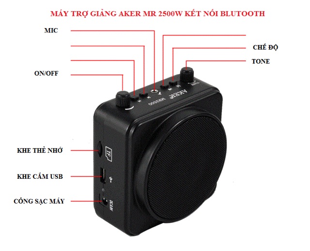 Máy trợ giảng không dây kết nối Blutooth Aker Mr 2500 hỗ trợ 5 chức năng tiện ích giải trí đa phương tiện: Khuếch đại âm thanh - FM Radio - Khe cắm thẻ nhớ - Khe cắm USB - đặc biệt kết nối với điện thoại di dộng qua Blutooth hiện nay trên thị trường chưa có loại này rất thuận tiện cho mọi người sử dụng để phát nhạc, bài giảng, hoặc thuyết trình có sẵn trong điện thoại.