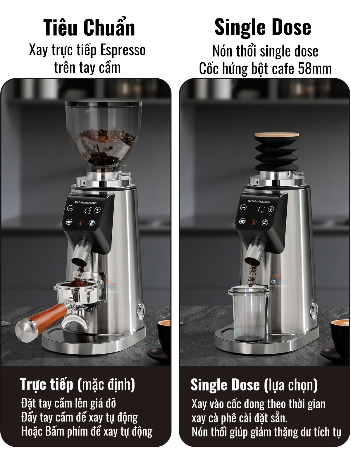 Ngoài ra, ở phiên bản G9A Full Single Dose, người dùng được trang bị thêm 1 cốc hứng bột cà phê 58mm và 1 nón thổi single dose bằng gỗ walnut cao cấp, giúp xay sạch hoàn toàn lượng cà phê còn sót, đảm bảo độ tươi mới và chính xác trong từng shot espresso.